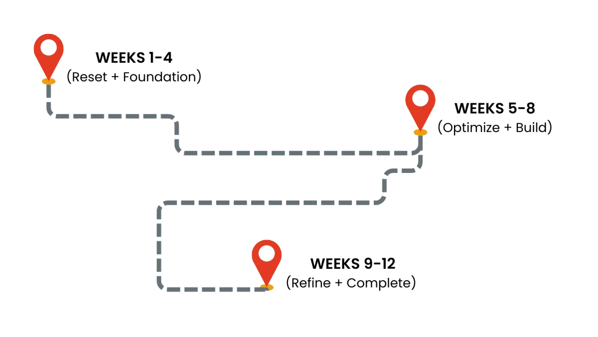 One 30-45 minute coaching call. Resistance training 3-4x per week (built around your schedule). Everything else integrates into your existing routine. This program was designed for high-achieving women who do not have time to waste.